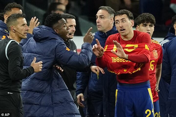 Vinicius, who had been replaced not long before, was pictured raging at the Spanish bench, wagging his finger as Spain's Mikel Oyarzabal appeared to try and calm him down.