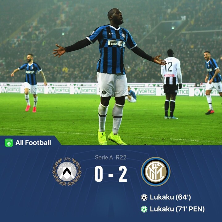 Udinese 0-2 Inter: Lukaku brace sends Inter back to 2nd & 3 points behind Juve