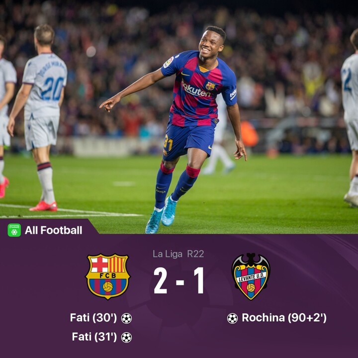Barcelona 2-1 Levante: Barca 3pts away from Madrid as Messi assists Fati twice