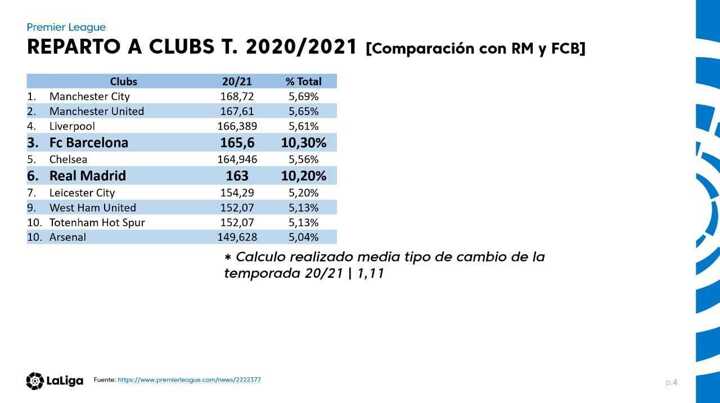 However, while English teams receive a figure closer to five percent of the TV rights, Real Madrid and Barcelona get over 10 percent of the total revenue.