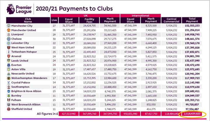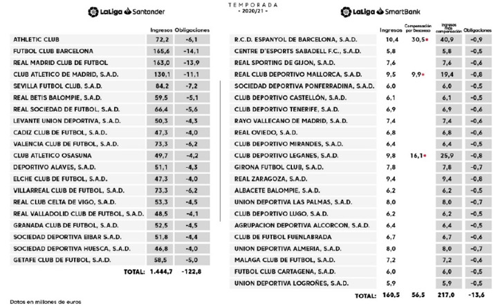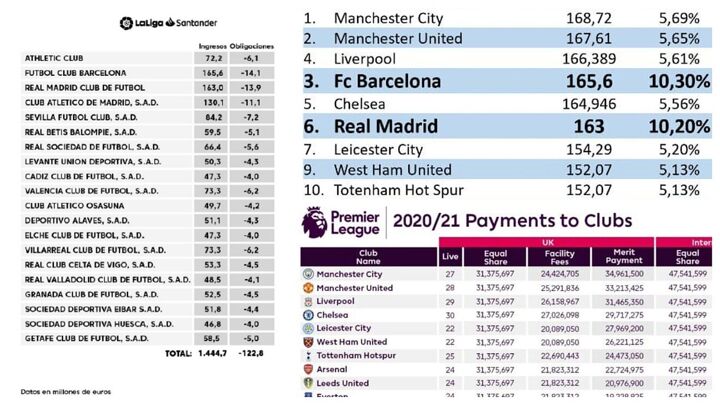 Both LaLiga and the Premier League have made public the distribution of their teams' revenues from TV rights in the coronavirus-hit 2020/21 campaign.