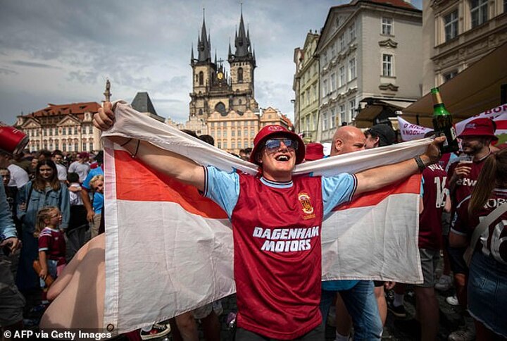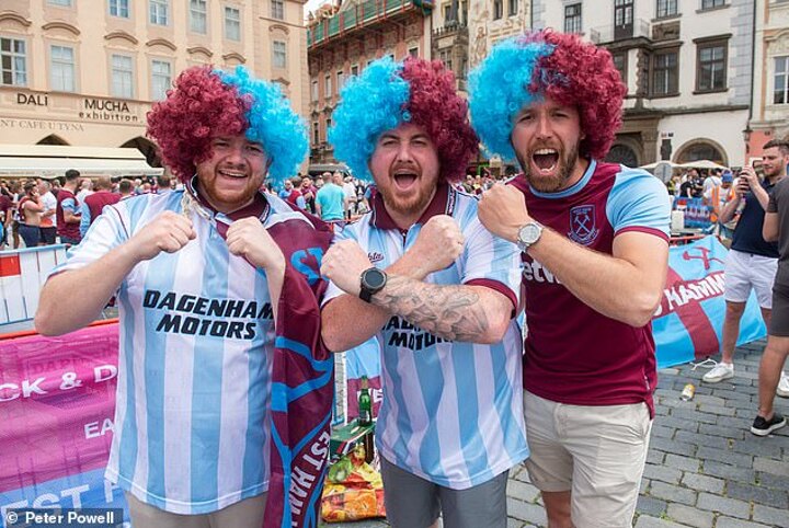 Actor and comedian James Corden, a lifelong West Ham fan, also flew into the Czech Republic and posed happily with supporters for photographs.