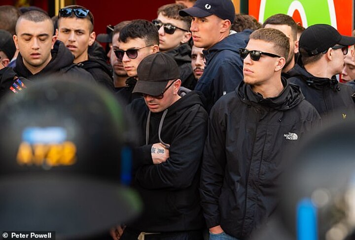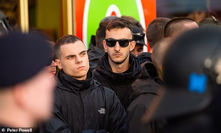 Another eyewitness, retired plumber John Brownlie from Cambridge, said: 'From nowhere about 100 men with chains, belts, bottles, and flares came round the street corner, and almost pushed over a lady and her baby in a pushchair.