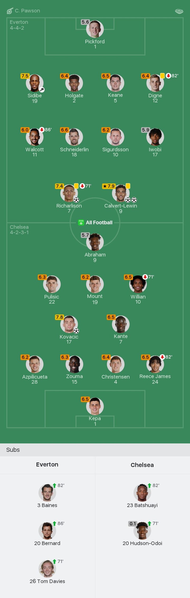 GOALLLLLLLLLLLLLLLLLLLLL!!!! CALVERT-LEWIN CONVERTS!!!! 2-0!!!! Everton double their advantage as Calvert-Lewin dispatches a low strike past Kepa. Christensen gets himself in a tangle failing to clear a cross into the box. Zouma cannot help his team-mate losing out to the Everton forward in a 50/50 battle. Calvert-Lewin takes one touch to take it away from the defender before slottiing his effort low into the net. Ferguson bounds down the sideline in joy.