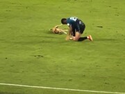 So funny! A dog ran onto the pitch and imitated movement after a player injured